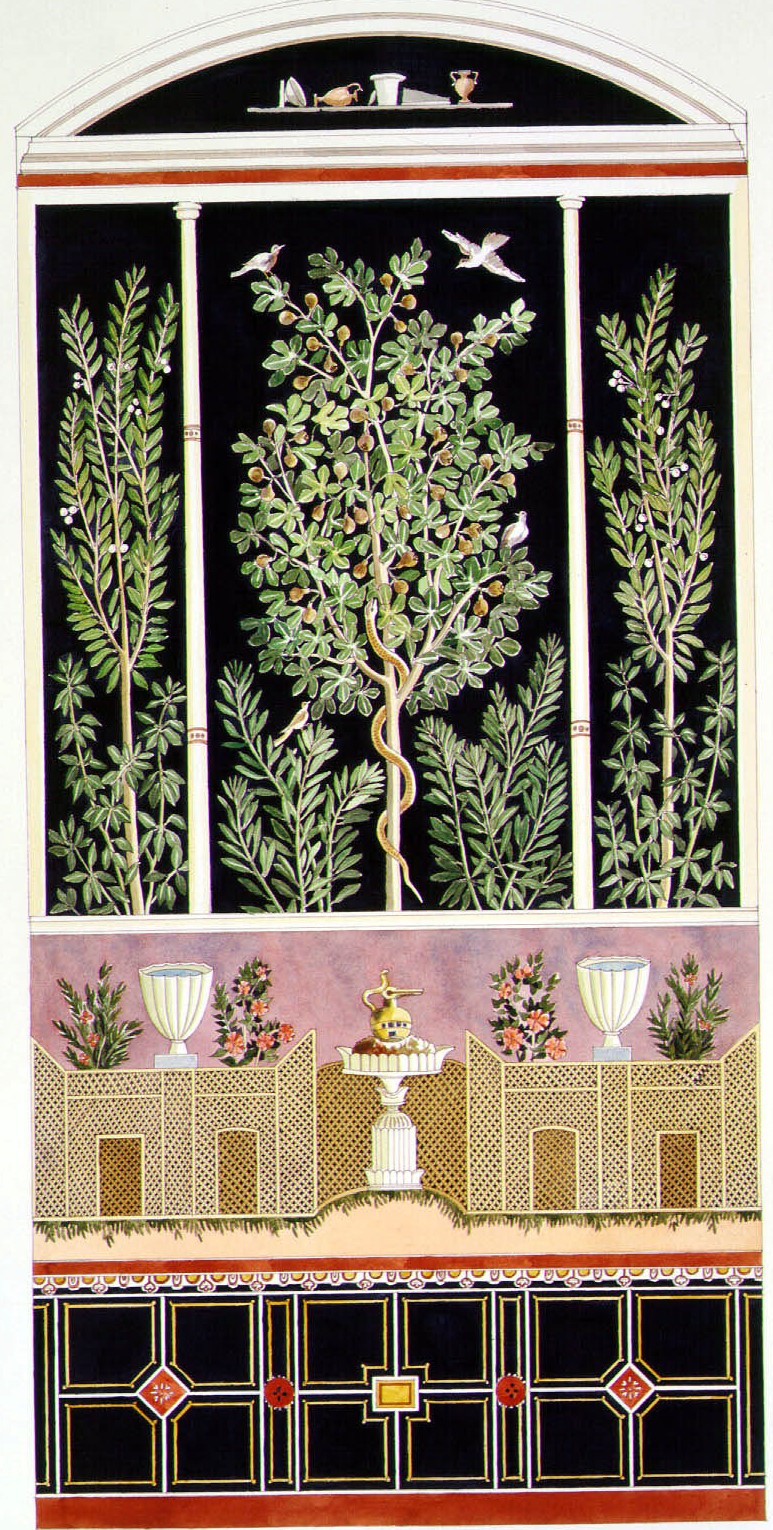 The most famous features of this House are the lavish decoration found in three of its rooms; two cubicula (small rooms, often bedrooms) (7, 8) and the dining room (9). The inside of room 7 has a floor design made of tiny tiles (a mosaic) and wall paintings of garden scenes with birds, flowers, statues and fountains. Included in this design are Egyptian motifs, showing that the owner knew of Egypt and its art, and perhaps wanted to make their house and tastes feel exotic. Room 8 is decorated in a similar style with trees, birds, snakes and other animals. The dining room (9) contains panels showing various myths including Daedalus and Icarus and the Seven Against Thebes. Roman houses were often decorated with landscapes, nature and mythological images.